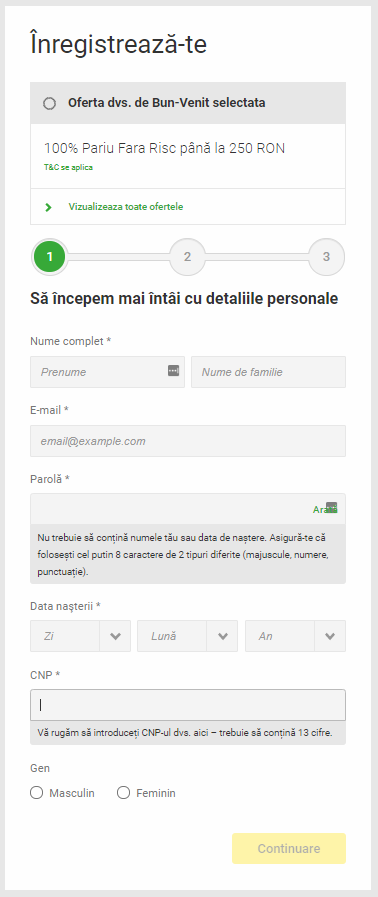 De asemenea, tot aici la înregistrarea contului, vei fi rugat să-ți alegi oferta de bun-venit pe care vrei să o primești. Poți să alegi 1000 Ron Bonus în Cazino, Bonus Progresiv de 200 Euro la Poker sau poți introduce un cod promoțional. Nu vedem de ce ai face acest lucru, dar dacă nu vrei un bonus, ai inclusiv opțiunea de a selecta că nu dorești un bonus de bun-venit.